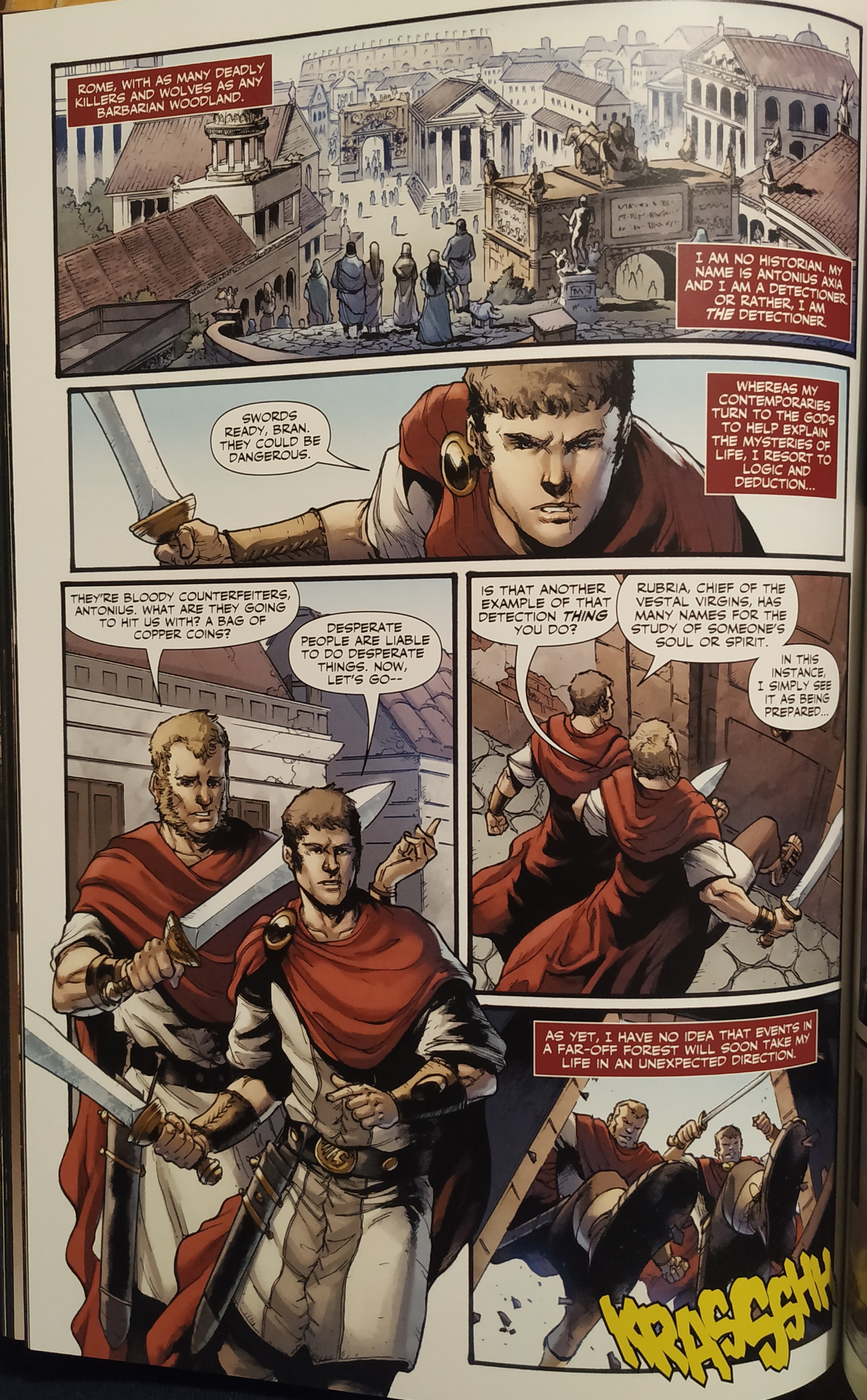 And the story goes as follows. A Roman centurion, Antonius Axia, gets traumatized when saving a Vestal from an ancient monster (more specifically, after seeing said monster). Then, the Vestals reprogram and train him, so he becomes Rome’s first detective. Or, as they call him, ‘detectioner’. Nothing new, standard superhero origin story. Kind of reminds me of Batman, now that I think about it.